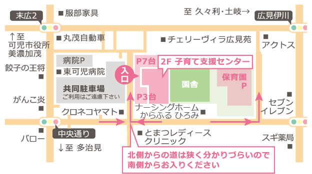 - 子育て支援センター駐車場が満車の場合は、可児さくら保育園正面駐車場をご利用ください。クロネコヤマト裏の東可児病院・チェリーヴィラ広見苑・可児さくら保育園の共同駐車場をご利用は、ご遠慮ください。